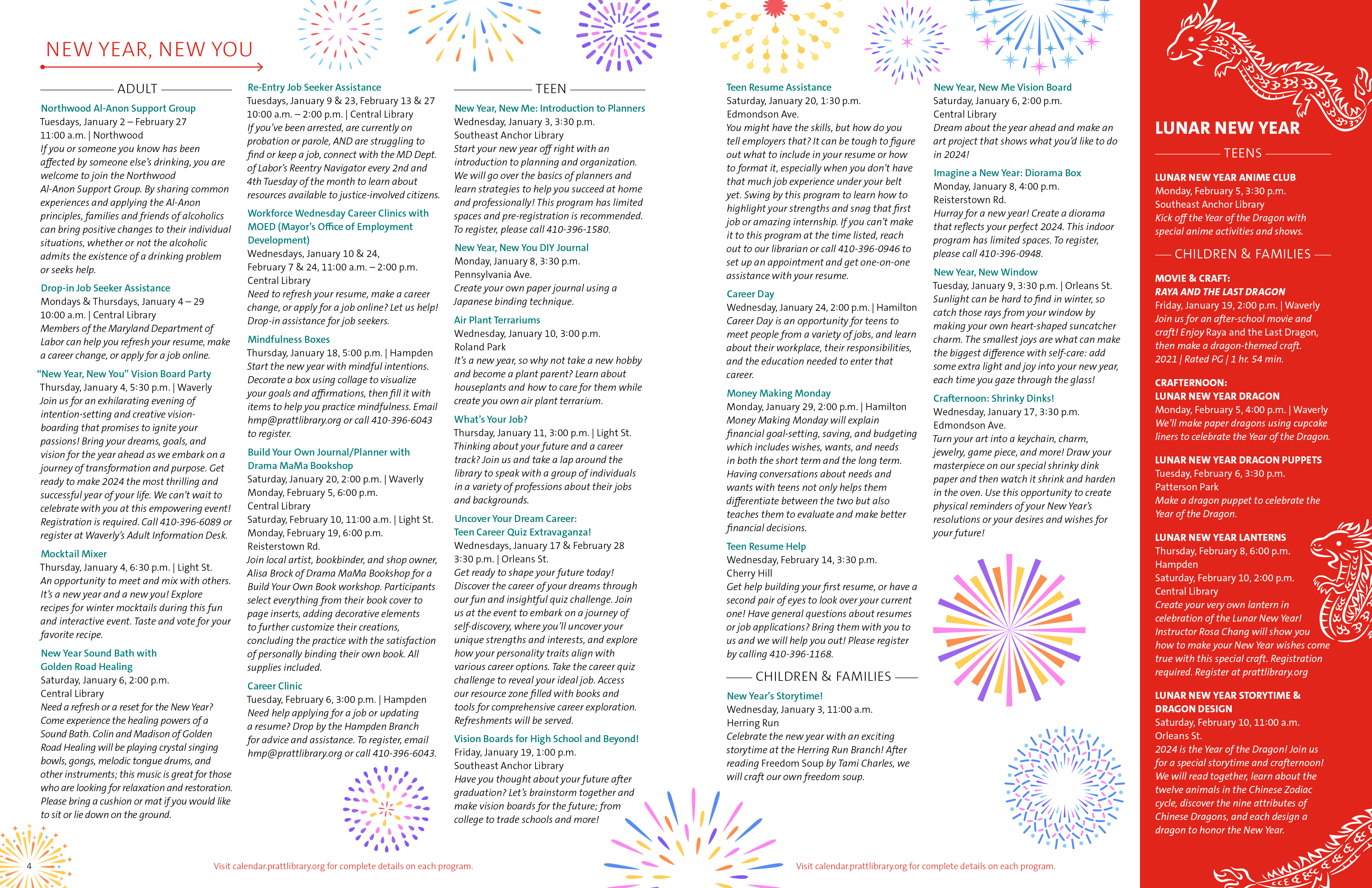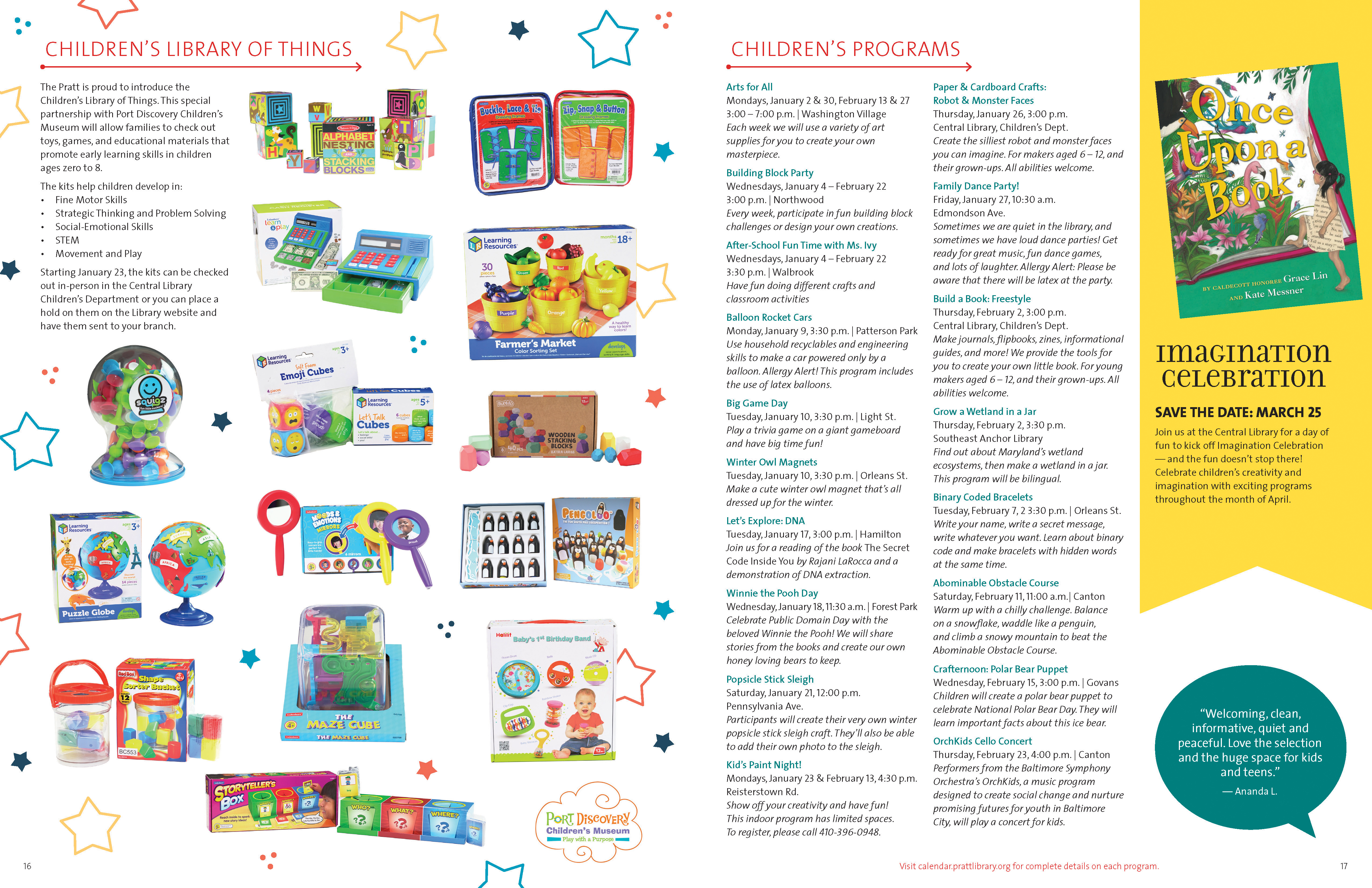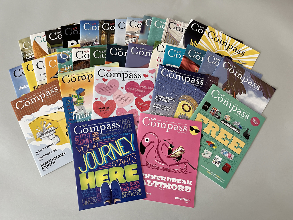Compass is the Pratt Library’s magazine newsletter. It contains news, articles, and events of the Enoch Pratt Free Library. Copies are mailed to households and are also available at all Pratt Library locations. View the most recent issue at prattlibrary.org/publications.